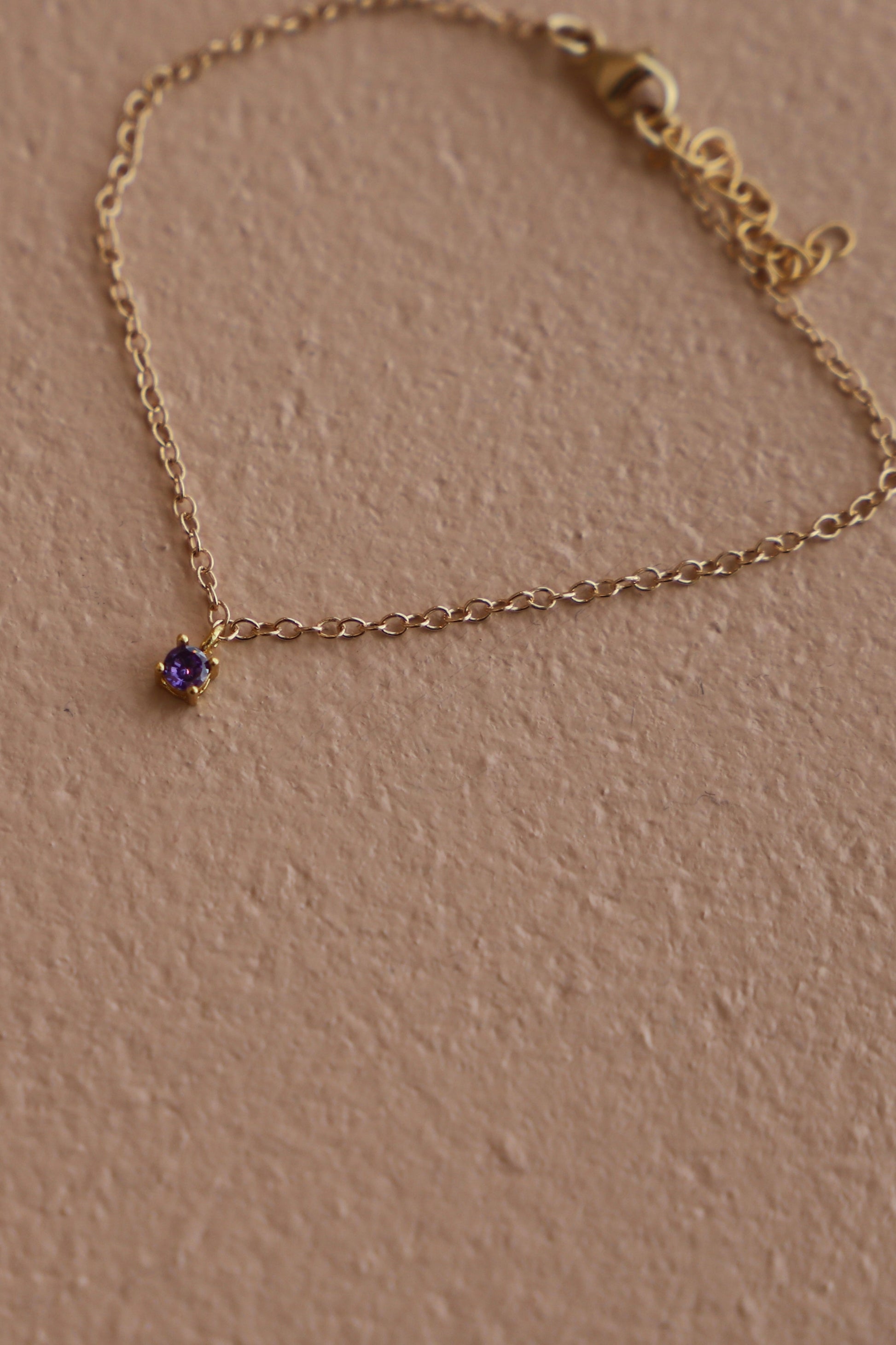This beautiful birthstone charm bracelet features a delicate gold chain and an amethyst charm, making it a perfect piece for a personalized gift or a special piece for yourself.