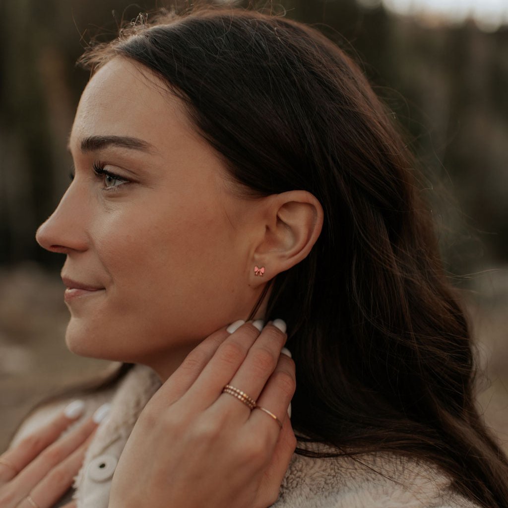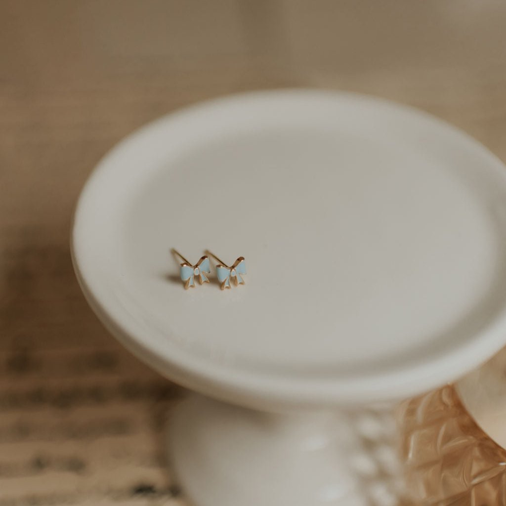 The Clara Bow Studs are the perfect, dainty earring that goes with everything! They are available in gold vermeil or sterling silver and are hypoallergenic, tarnish and wear resistant, and perfect for sensitive ears. Available in the cutest shades of baby blue or pink rose.
