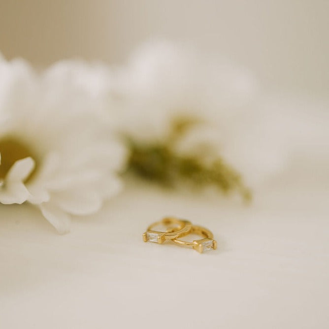 The Sophie Baguette Diamond Mini Hoops are the perfect accessory for any outfit. Available in high quality sterling silver and gold vermeil, these huggies are hypoallergenic, good for sensitive skin, and wear and tarnish resistant. Diamond is made of high quality cubic zirconia.