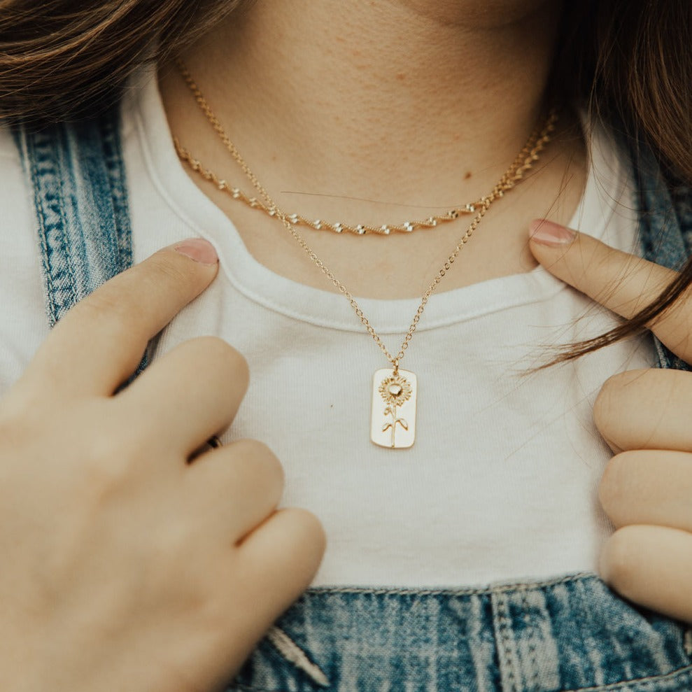 The Sunflower Necklace is a new piece in the floral collection and is the perfect summer accessory. Gold filled pendant measures 22m x 12mm and is available on either a 17.5" chain or 19" chain for however you choose to layer. Perfect as a stand alone piece or to complete a necklace stack. The sunflower is slightly 3D and come out of the pendant by 2mm.